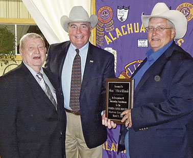 L-R: Long-time Alachua Lions Club member Ralph Cellon, Alachua County Director for the Florida Cattlemen’s Association Dr. Ashby Green and Jim Strickland. Strickland was the 2014 Lions Club Cattlemen of the Year award recipient.