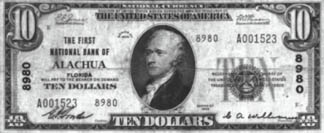 The center of town in those early days was just north of the Seaboard tracks, on the southern end of Main Street, as I think of it today. There were two hotels and stores of all types. The town also had two banks: the Bank of Alachua and the First National Bank. The Bank of Alachua did not survive the depression. The First National Bank survived until recently when it was sold to Capital City Bank.